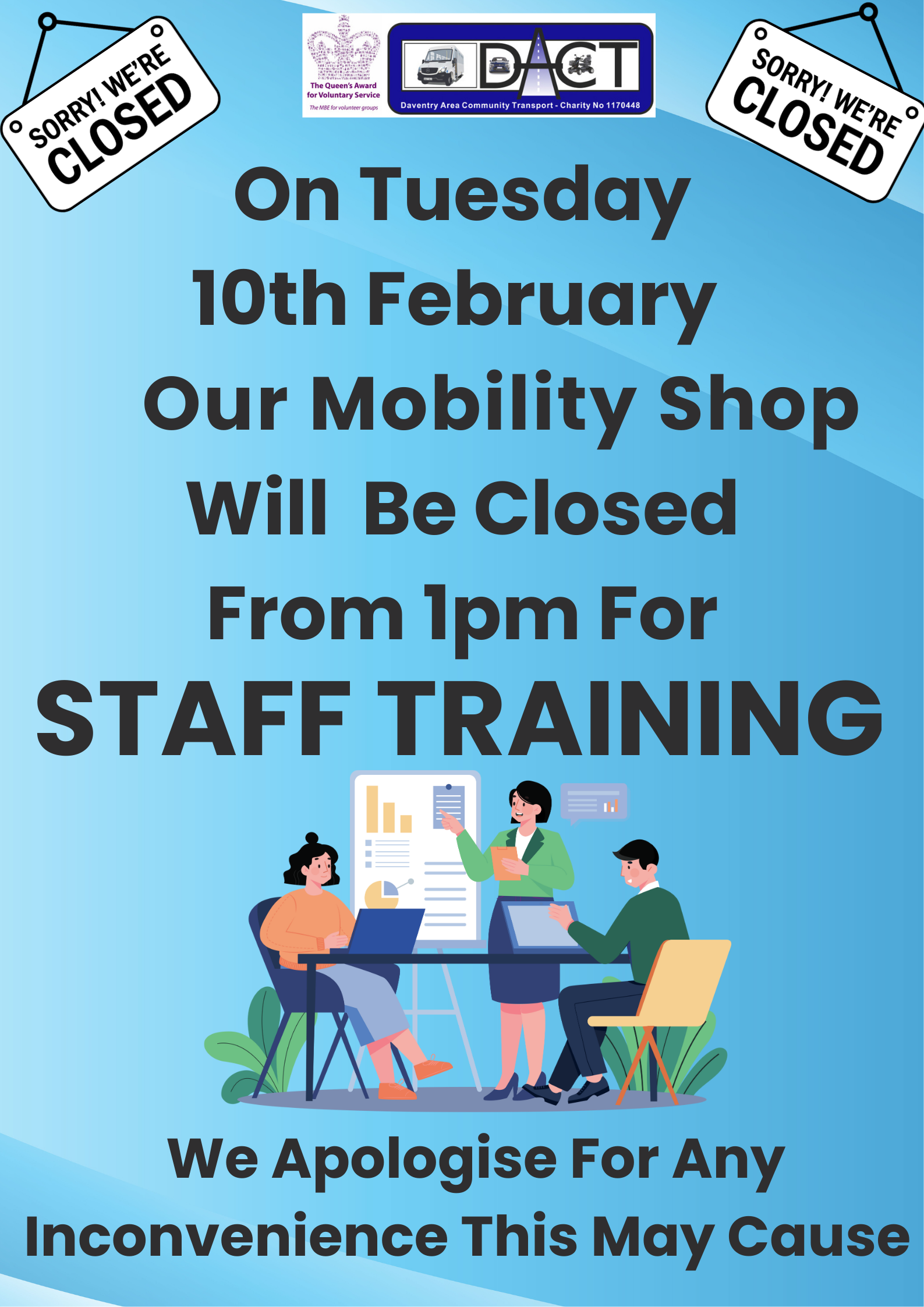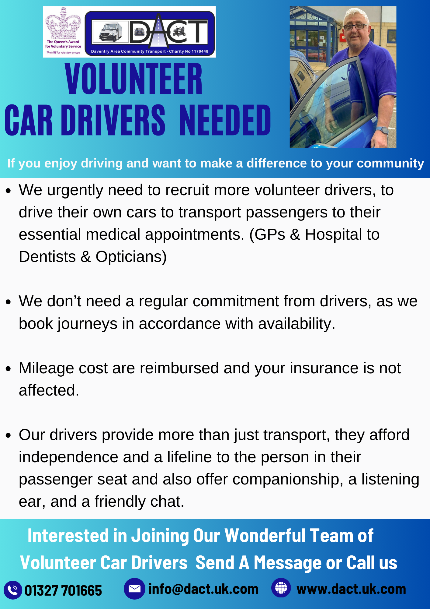 Medical Appointments Car Scheme ~ DACT Days Out ~ Affiliated Group Hire ~ Village Travel Clubs Hire ~ MIDAS Training ~ Daventry Town Community Bus ~ Mobility Shop ~ Mobility Scooters & Wheelchairs Hire ~ Mobility Repairs & Servicing Workshop ~