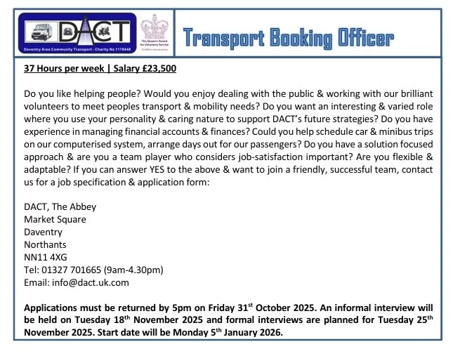 DACT are looking for a new team member within our small team, with the main responsibility of looking after our passengers and volunteers that live within the villages surrounding Daventry. If you are interested and you feel you are the person in the advert below, please do get in touch for an application pack.